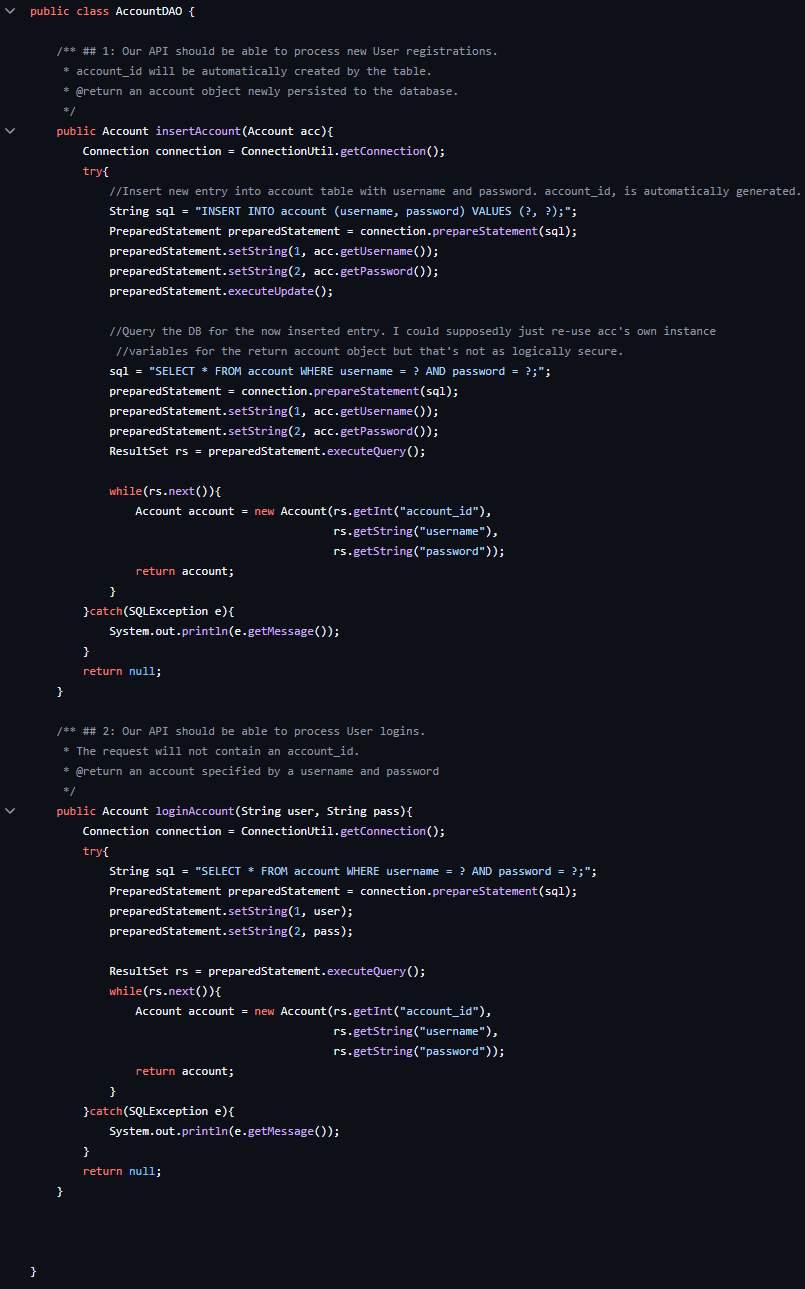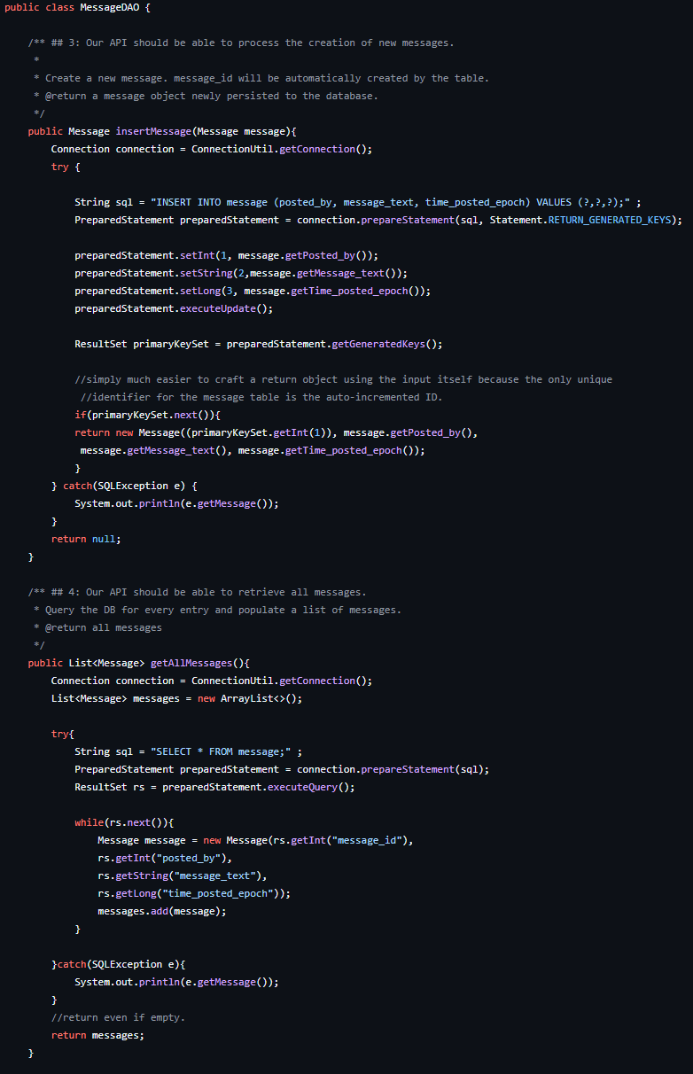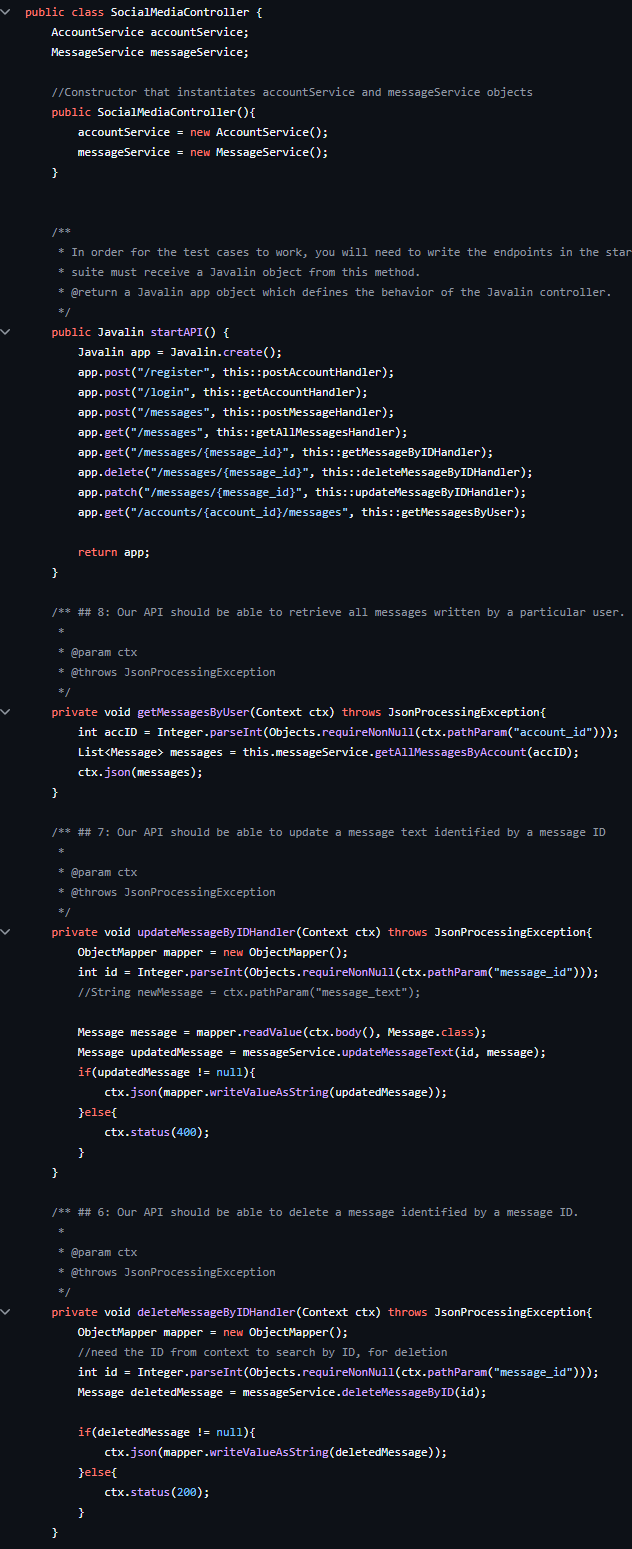 A backend project for a Social Media Application that manages user accounts as well as their messages to the application. The API utilizes the Model-View-Controller Framework, the Data Access Object Framework, and Java language.